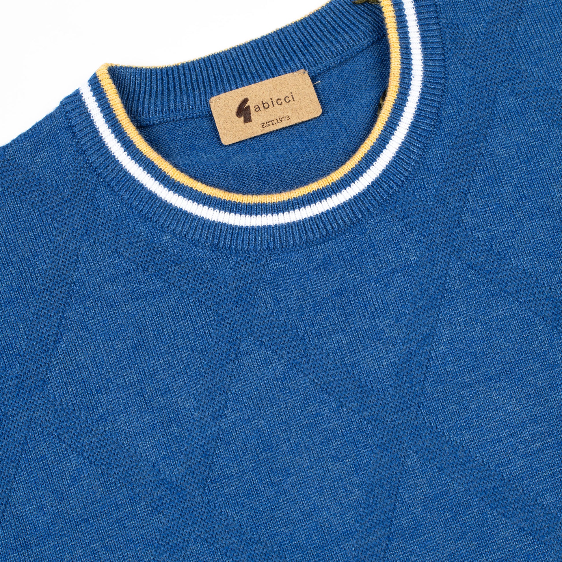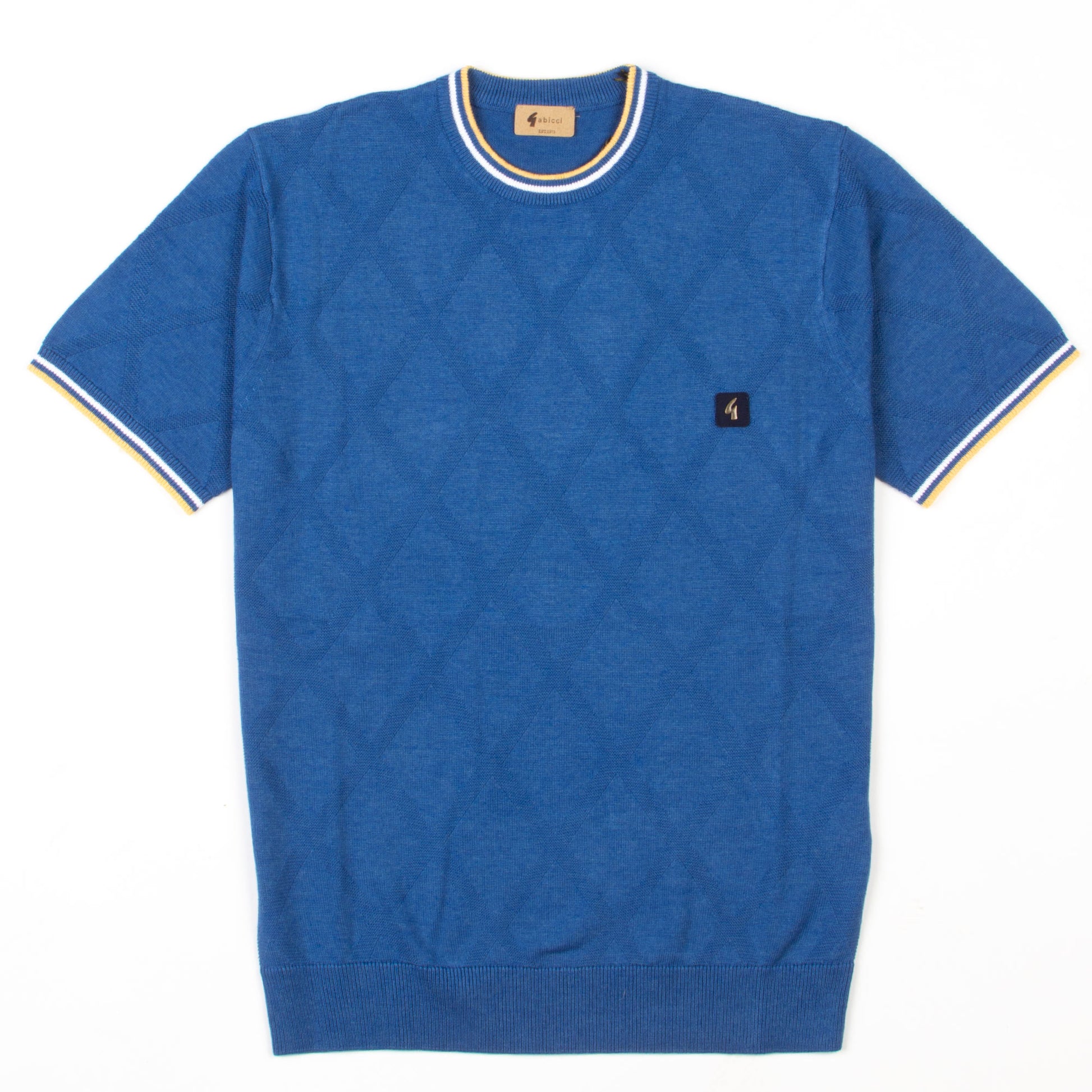 Add a pop of colour to your wardrobe with this sapphire blue crew neck knit from the Gabicci Vintage SS25 line. Featuring a subtle diamond-textured knit, white and yellow tipping on the collar and sleeves, and finished with the iconic Gabicci logo badge, this top blends heritage vibes with a fresh, standout hue.