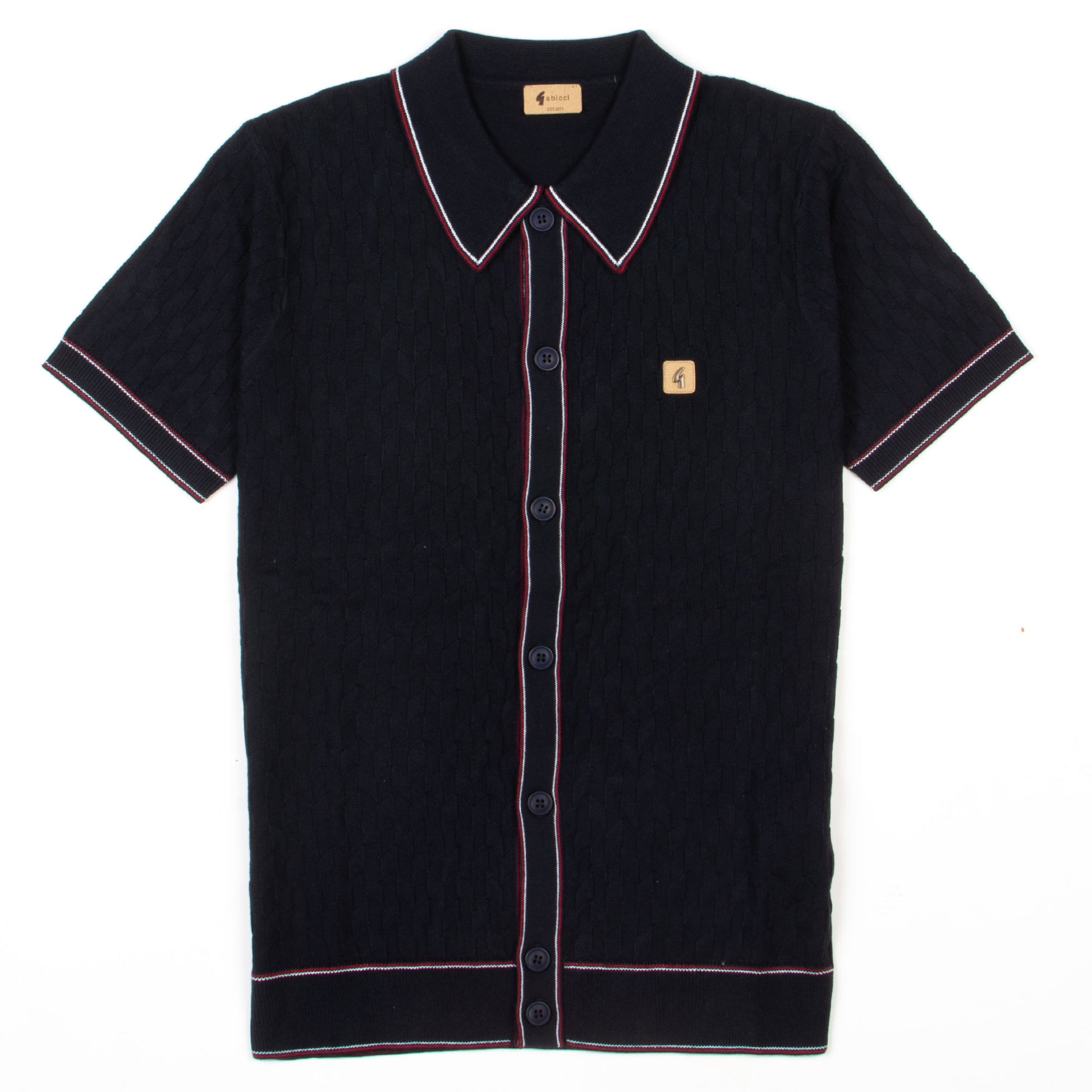 The bold piping gives the shirt a tailored look, making it feel like a cross between a retro cardigan and a knit polo – perfect for those who love vintage-inspired style that’s just a little different. Finished with a smart spread collar and the iconic Gabicci “G” tab, it’s a top that quietly commands attention.