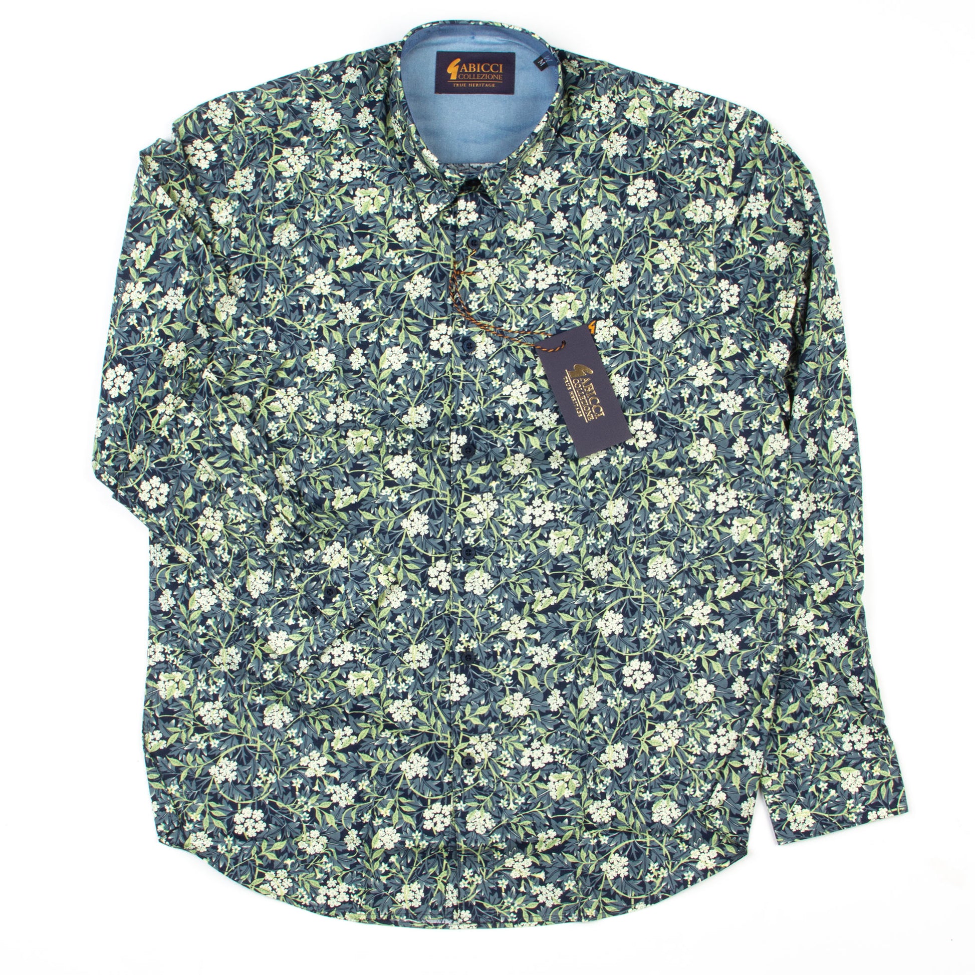 This Gabicci long-sleeve men's shirt features an intricate floral pattern set against a dark background. The design consists of lush green vines and delicate white flowers, creating a sophisticated yet nature-inspired look.
